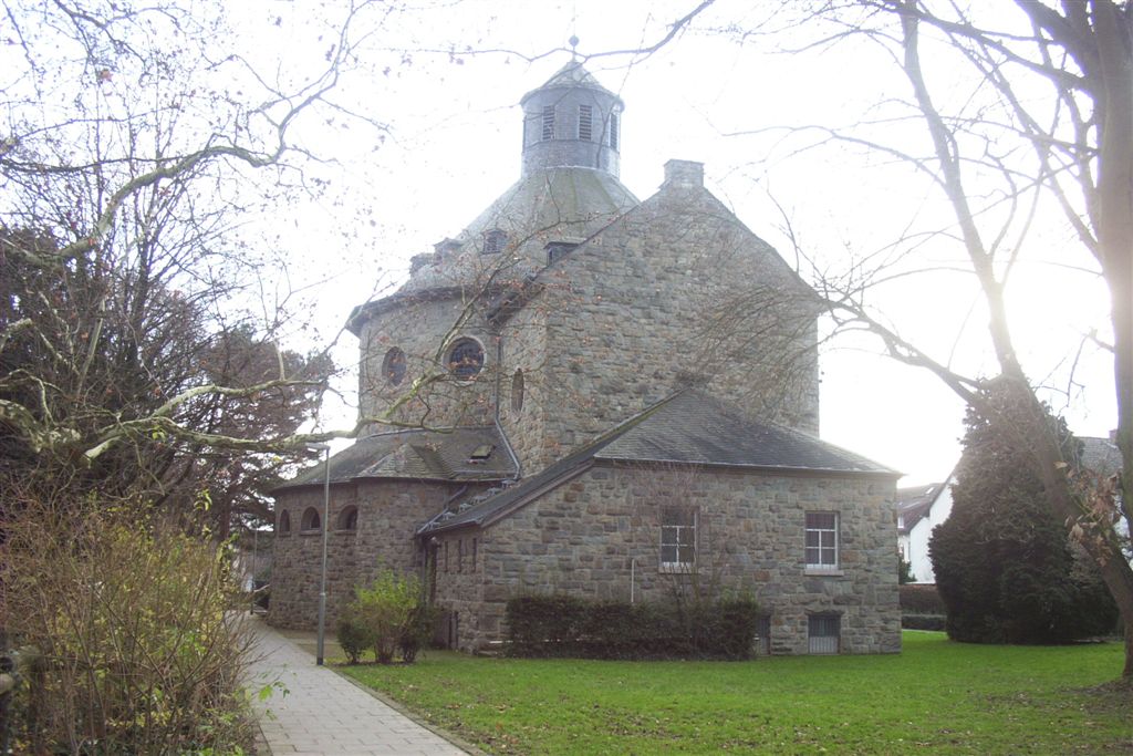 links die alte Markuskirche (1725), rechts das ehemalige Gesindehaus des Hofgutes der Familie von Gagern, seit 1954 Pfarrhaus